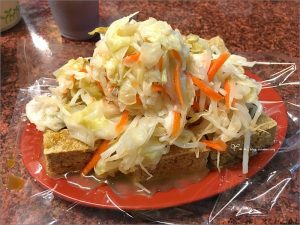 « [南投中興新村] 南京老戴脆皮臭豆腐~ 光明市場隱藏版美食,泡菜高得像座大山!
