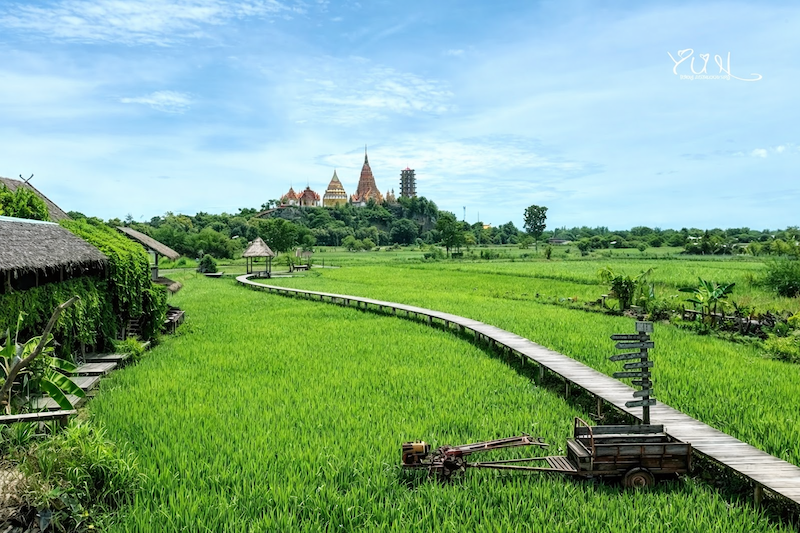 北碧府人氣網美打卡咖啡廳~MEENA Cafe,坐擁大片稻田美景,遠眺虎穴寺,漫遊田間小徑,享受悠閒的愜意時光!飲品漸層或裝飾都很適合打卡,還有披薩、炸物、飯類等,價格不貴,味道也不錯,是不踩雷的網美餐廳!